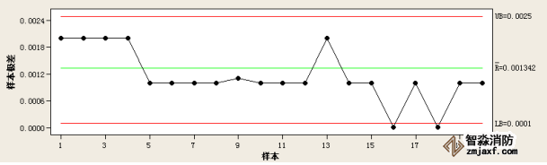 在上6、7圖中可看出,控制圖中的曲線在控制范圍內(nèi),依據(jù)控制圖判斷準(zhǔn)則所評(píng)測(cè)量機(jī)的測(cè)量是穩(wěn)定的。