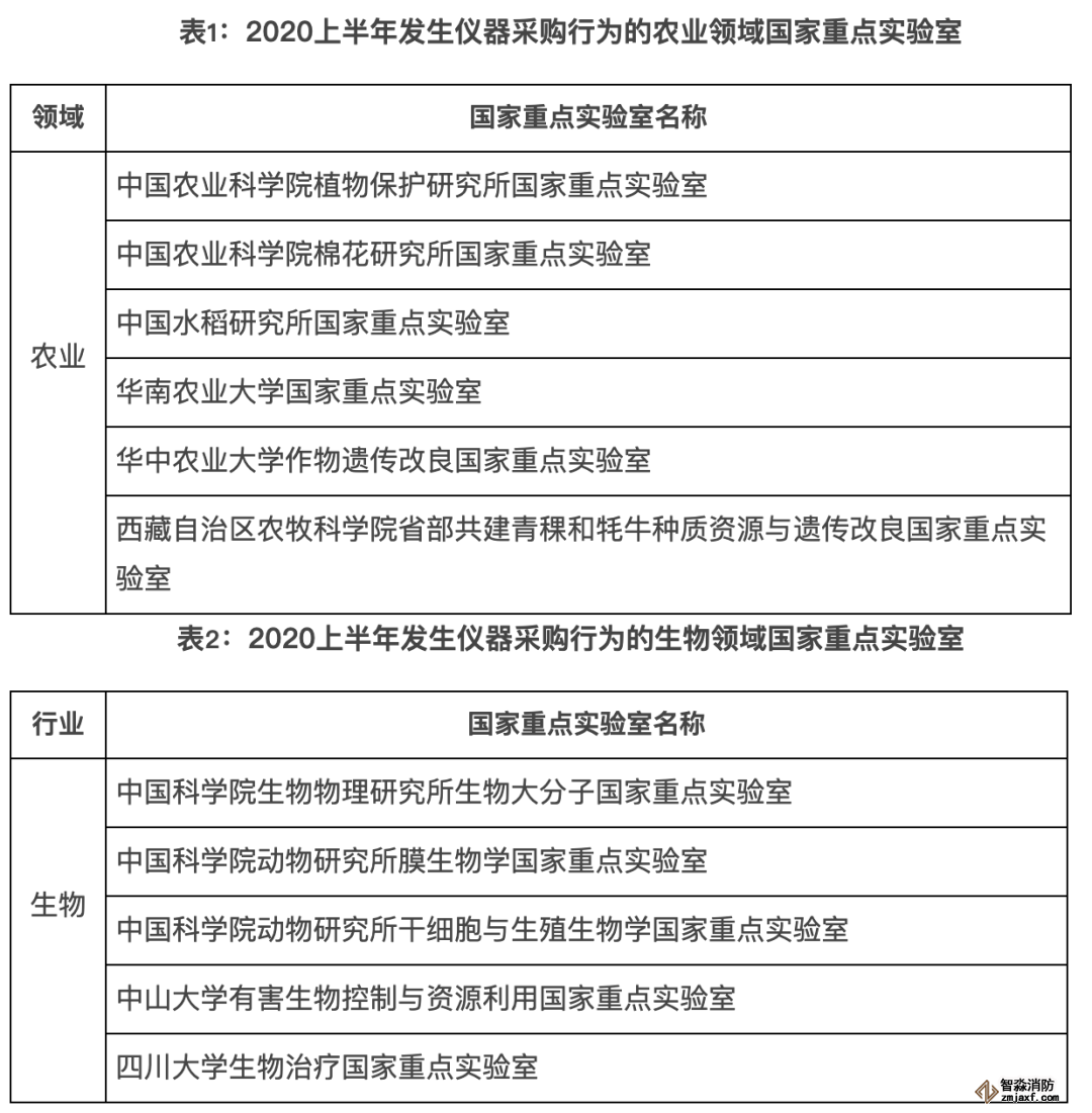 而在2020年上半年采購(gòu)儀器的國(guó)家重點(diǎn)實(shí)驗(yàn)室中,共有7家來(lái)自農(nóng)業(yè)領(lǐng)域,5家來(lái)自生物領(lǐng)域,合集數(shù)量占比竟高達(dá)60%,詳情如圖2所示。這也充分印證了2020年,我國(guó)在農(nóng)業(yè)和生物領(lǐng)域的基礎(chǔ)研究需求旺盛,活力滿滿。